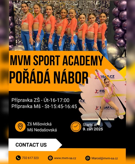 MVM Sport Academy Sportovni klub se zamerenim na sportovni aerobic na Zlicine Prihlaska zde httpmvmsa. czdokumenty Vyplnene prihlasky posilejte na marcelmvmsa. cz Pripravka pro Zs 611 let Zaciname jiz 10. zari Utery 1600 1700 Zs Misovicka Cena 1500 kc Zari Leden Zavodni aerobik od sesti let Zaciname jiz 3.