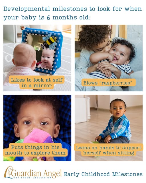 Here are some milestones to look for when your baby is 6 months old: 🪞 Likes to look at self in a mirror 😛 Blows “raspberries” (sticks tongue out and blows) 🧸 Puts things in her mouth to explore them 🫷🏽 Leans on hands to support herself when sittin Find more milestones and resources at https://www.cdc.gov/ncbddd/actearly/milestones/milestones-6mo.html. Guardian Angel provides the support and education necessary for your child to flourish! Learn about our programs at https://gasastl.org/about-our-childcare-programs/. (fb)