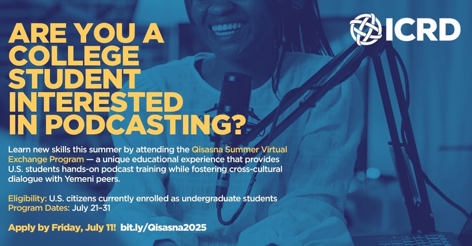 🎙️ Calling all U.S. undergrads! Have you ever been curious about podcasting? Apply now for the Qisasna Summer Virtual Exchange Program (July 21–31), a unique opportunity to build podcasting skills while learning alongside Yemeni peers. Eligibility: U.S. citizens currently enrolled as undergraduate students Apply by Friday, July 11! bit.ly/Qisasna2025 For any inquiries, please contact Loujain Kiki at Loujain@icrd.org. (fb)