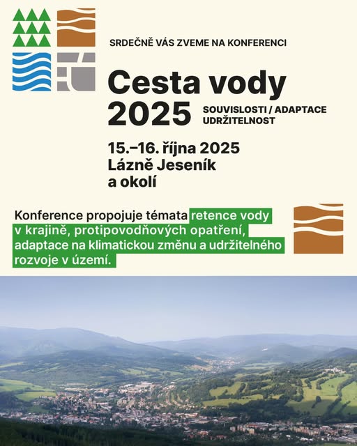 Přidejte se k nám na druhý ročník konference Cesta vody. Pojďte se s námi potkat během přednášek nebo přímo v terénu. Cesta vody propojí klíčová témata hospodaření s vodou – retenci v krajině, protipovodňová opatření, adaptaci na klimatickou změnu i udržitelný rozvoj území. 📅 15.–16. října 2025 📍Lázně Jeseník 👉 A na koho se můžete těšit? 🔹 Radim Tolasz – vedoucí oddělení klimatické změny, Český hydrometeorologický ústav 🔹 Eva Procházková – odborná garantka, NUIK 🔹 Magdalena Davis – ředitelka klimatických programů, Člověk v tísni 🔹 Petr Birklen – generální ředitel, Povodí Odry 🔹 Zdeňka Blišťanová, starostka, Město Jeseník 🔹 František Pavlík, ředitel, Státní pozemkový úřad …a mnoho dalších odborníků z oblasti klimatické adaptace, lesnictví, zemědělství i správy toků. Záštitu nad konferencí převzali ministr životního prostředí Petr Hladík, ministr zemědělství Marek Výborný a hejtman Olomouckého kraje Ladislav Okleštěk. Součástí programu budou také terénní exkurze s ukázkami dobré praxe a inovativních řešení, které pomáhají krajině lépe zadržet vodu a chránit nás před povodněmi i suchem. 🎟 Místa se plní, neváhejte dlouho. Detailní program a vstupenky najdete na 👉 www.cestavody.eu Pořadatelé: Národní ústav pro integrovanou krajinu - NUIK a Člověk v tísni Za podpory: ADAPTO.space, Sdružení měst a obcí Jesenicka Ve spolupráci: Město Jeseník, Aquainova, Priessnitzovy léčebné lázně, Obec Písečná, skupina Yottabe Mediální partneři: Moderní obec, Zemědělec.cz (fb)