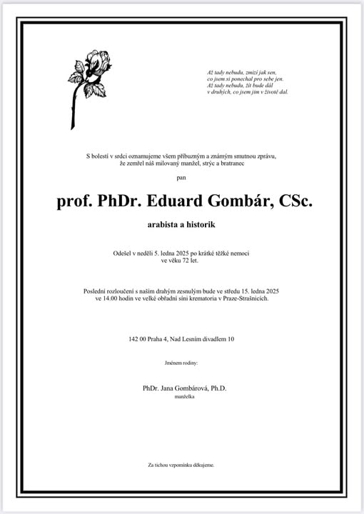 🩶Se hlubokou lítostí oznamujeme, že zítra, 15. ledna 2025 ve 14:00 hodin proběhne ve velké obřadní síni krematoria v Praze-Strašnicích poslední rozloučení s prof. PhDr. Eduard Gombár, CSc. Pan profesor byl i našim hlavním hostem na loňském festivalu a vzpomínka na něj nás bude vždy hřát u srdce. Níže připomene i jeho celoživotní práci, která byla přínosná pro naši společnost. Eduard Gombár (14.10.1952-5.1.2025) · vysokoškolský pedagog, diplomat, historik Blízkého východu a mezinárodních vztahů, arabista a islamolog V roce 1977 absolvoval historii, filozofii a arabistiku na Filozofické fakultě Karlovy univerzity v Praze (FFUK). Od roku 1978 působil na fakultě věd o zemích Asie a Afriky FFUK jako odborný asistent. V roce 1981 získal vědeckou hodnost kandidáta historických věd, a jeho vědecká a pedagogická činnost byla potvrzena v březnu 1988, kdy byl jmenován docentem obecných dějin. V letech 1991 až 1993 působil v diplomatických funkcích v Libyi a Sýrii. V lednu 1993 se vrátil zpět na FFUK, kde byl letech 2004-2014 ředitelem Ústavu Blízkého východu a Afriky. Od roku 1995 působil pedagogicky rovněž na Vysoké škole ekonomické, kde v roce 2008 získal vědeckou hodnost profesor mezinárodních politických vztahů. Od roku 2000 působil rovněž na Vysoké škole finanční a správní a od roku 2016 též na Vysoké škole mezinárodních a veřejných vztahů, kde byl posledních letech vedoucím Katedry mezinárodních vztahů a diplomacie. V letech 1994–99 byl viceprezidentem Česko-arabské obchodní komory a od 1993 místopředsedou Společnosti česko-arabské. V letech 2008–12 byl reprezentantem ČR v poradním výboru nadace Anna Lindh Foundation pro euro-středomořský dialog. V letech 1993–97 byl poradcem Ministerstva financí, 2002 Ministerstva obchodu a průmyslu, a v letech 2014–17 poradcem ministra zahraničních věcí. Autor publikací: Dějiny Libye · Dějiny Iráku · Dějiny Egypta · Kmeny a klany v arabském Maghribu · Kmeny a klany v arabské politice · Moderní dějiny islámských zemí · brzy vyjdou Dějiny Sýrie (fb)