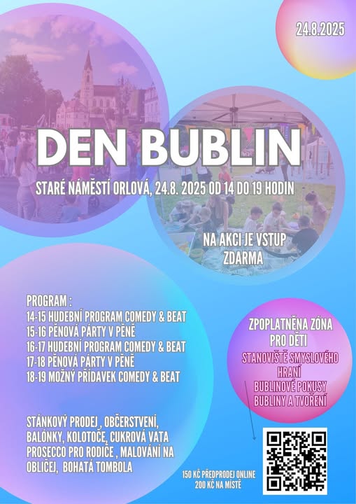 Den Bublin 2025 - Orlová již v neděli 24.8. od 14 do 19 hodin. Akci pořádá spolek Naše hnízdo ve spolupráci s dalšími místními dobrovolnickými spolky. Vstup na akci je zdarma, zahraje a vystoupí Comedy & Beat , zabaví děti bublinami a kdo ví, možná předvedou i bubenickou školičku pro děti. Za odpoledne pro vás 2x uděláme pěnu přes náměstí. Doporučujeme starší a taky náhradní oblečení pro děti 🫧🙂. Dále běží předprodej vstupenek do dětské herní zóny, kde budou připravena stanoviště smyslového hraní, pokusy s bublinami a tvoření. Každé děti obdrží balíček, kde bude mít vše potřebné na pokusy a tvoření, abychom mohli zajistit obslužitelnost kdykoliv přijdete. Pokud byste si na stanovištích nevěděli rady, kontaktujte někoho s tričkem našeho hnízda nebo s vizitkou dobrovolník. Každé děti, které se zúčastní aktivit v placené zóně si nakonec vyzvedne odměnu. Není to úžasné? 🤩 ✨Vstupenku jde zakoupit online v předprodeji za zvýhodněných 150 Kč (platí se za dítě, v zóně můžete zůstat neomezenou dobu a taky se do ní vracet - s platným páskem na ruce, který si vyzvednete u nás na stánku). Na místě lze zakoupit vstupenku za 200 Kč. Platit se dá hotově i kartou. Přijďte podpořit naši akci. Doprovodným programem jsou kolotoče, stánkový prodej, Salute Prosecco Van Ostrava , občerstvení, tombola, balónky a nakonečna zábava 🎡🫧 Pozvěte kamarády a pojďte se bavit. 🍻🚀😁 Dekujeme za podporu Město Orlová (fb)