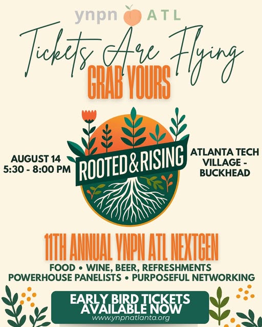Tickets Are Flying…and you DON’T want to miss this! Grab yours NOW for the 11th Annual YNPN ATL NextGen event: Rooted & Rising! 🌱🔥 🗓 August 14 | ⏰ 5:30 – 8:00 PM 📍 Atlanta Tech Village – Buckhead 🍷 Food, wine, beer + refreshments 🎤 Powerhouse panelists 🤝 Purposeful networking with ATL’s top nonprofit + social impact leaders! Let’s grow together 🌿 — secure your EARLY BIRD TICKETS before they’re gone! 🎟️ www.ynpnatlanta.org (or LINK IN BIO) #YNPNAtlanta #RootedAndRising #NextGenATL #AtlantaEvents #SocialImpact #ATLNetworking #NonprofitLeaders #YoungProfessionals #LeadershipMatters #PurposeDriven #ATLCommunity #YNPNNextGen (fb)