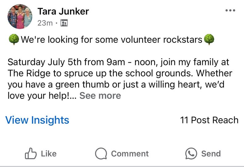 If you aren’t on our Rejuvenate the Ridge page you may have missed this invitation. A group of volunteers are gathering at the school from 9am - Noon this Saturday to help “spruce up” the school grounds. Feel free to bring weedwackers, clippers, blowers, gloves, or any other tools that might be relevant to outdoor landscaping! (fb)
