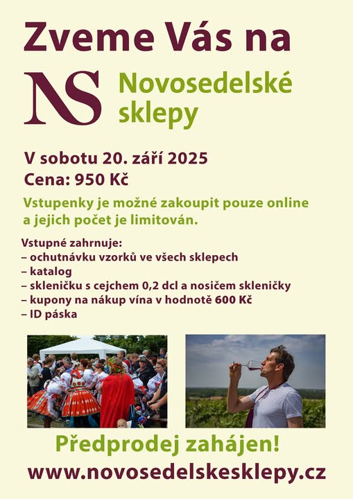 Přijďte zažít den plný vína, tradic a podzimní atmosféry! 🍷 Otevřené sklepy a novosedelské vinobraní. Již za dva týdny! 🍷✨ Srdečně Vás zveme na Novosedelské sklepy open - září 2025 📅 Sobota 20. září 2025 💰 Cena: 950 Kč Vstup zahrnuje ochutnávku vín ve všech sklepech, katalog, skleničku s nosičem, ID pásku a kupóny na víno v hodnotě 600 Kč. 🍇 🎟️ Vstupenky pouze online, počet je omezen → www.novosedelskesklepy.cz (fb)