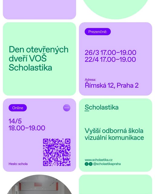 🚪✨ Zveme vás na Dny otevřených dveří VOŠ Scholastika, kde vás přivítáme v prostoru naší školy, představíme vzdělávací program a koncepci výuky a zodpovíme veškeré vaše dotazy. Zároveň budete mít možnost seznámit se s vedením školy a pedagogy. PREZENČNĚ 26/3 17.00–19.00 22/4 17.00–19.00 📍Římská 12, Praha 2 ONLINE 14/5 18.00–19.00 📍 ZOOM 🔗 Více informací o Dnech otevřených dveří naleznete v biu! www.scholastika.cz | #scholastikapraha #scholastika #skolaumeni #skoladesignu #vosscholastika #prijimacizkousky #talentovky (fb)
