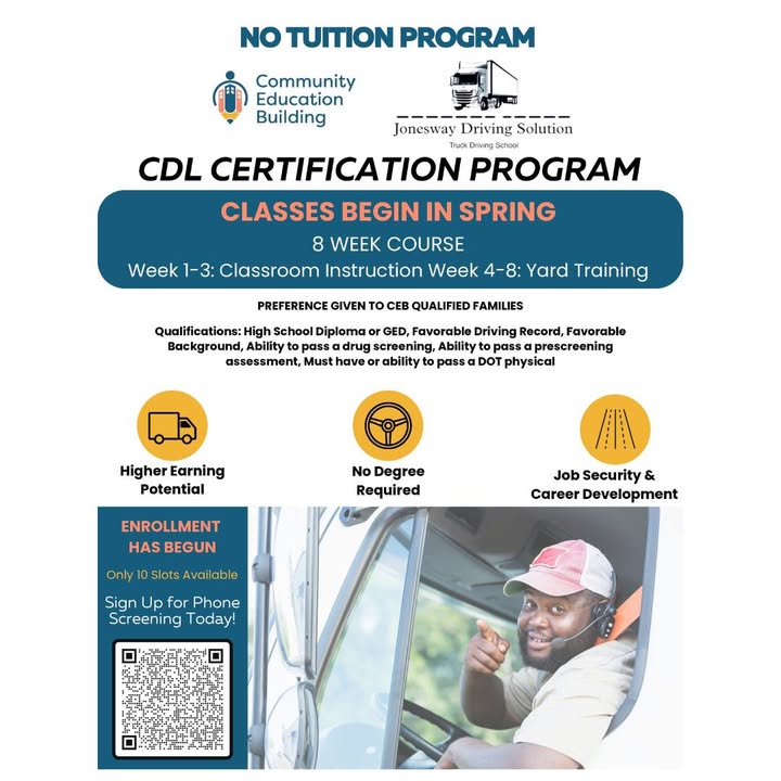 ONLY A FEW SPOTS LEFT! CEB Parents and Families! Please take advantage of this amazing opportunity the Family Resource Center and @jonesway_driving_solutions is offering this Spring!! TUITION IS COVERED! #cebofde #cebde #careerreadiness #cdltraining #wilmingtonde #signupnow (fb)