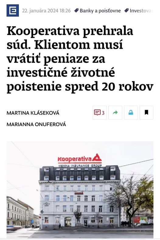 Stejnou problematiku investičního životního pojištění jako v ČR řeší i na Slovensku a rozsudek Okresního soudu v Prešově potvrzuje to, co dlouhodobě říkáme... https://e.dennikn.sk/3788048/kooperativa-prehrala-sud-klientom-musi-vratit-peniaze-za-investicne-zivotne-poistenie-spred-20-rokov/ (fb)