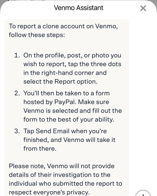 Hello friends, unfortunately, our Venmo account has been cloned. Someone has made a nearly identical account to ours (they just added a dash to our handle) and they have been sending out requests for money. DO NOT send them money! Please report to Venmo by following the instructions in the screen shot here. (fb)