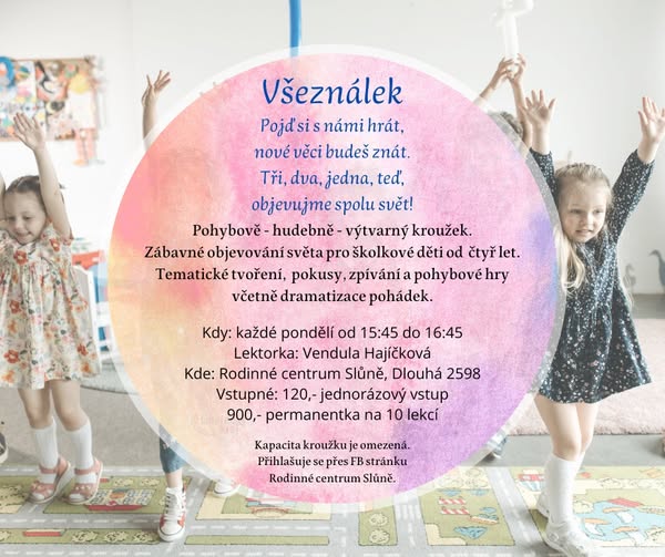 (sdílení potěší) MÁTE ŠKOLKOVÉ DÍTKO starší 4 let? Právě pro něj je náš kroužek Všeználek! Pro čtvrtletí 4-6/2025 máme tři až čtyři volná místa. :-) Případné zájemce prosíme o zprávu do zpráv / do komentářů. :-) (fb)