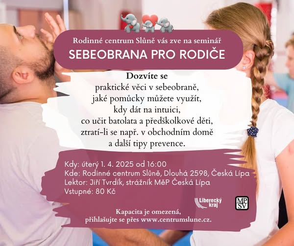 (sdílení potěší) V ÚTERÝ 1.4. nás od 16:00 čeká po dlouhé době SEBEOBRANA PRO RODIČE se strážníkem Městské policie Česká Lípa, panem Jiřím Tvrdíkem. Vstupné symbolických 80 Kč. Minimální kapacita 5 účastníků. Přihlášky prosíme na webu: https://centrumslune.cz/seminare-webinare/83-sebeobrana-pro-rodice.html (fb)