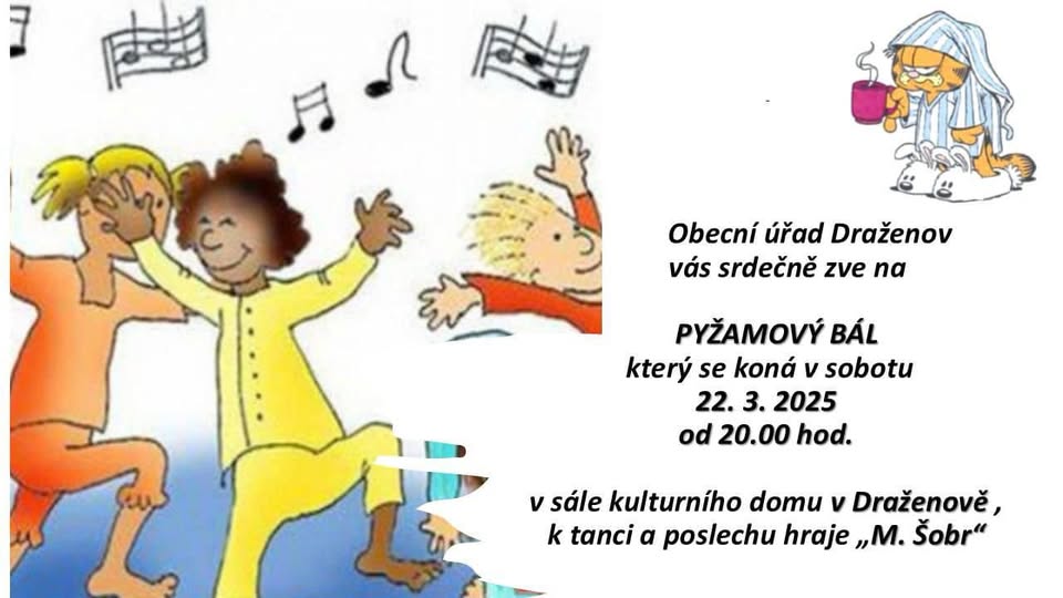 Pozvánka na Pyžamový bál do Draženova, který se koná 22.3. Vstupné na místě 100,- Kč. (fb)