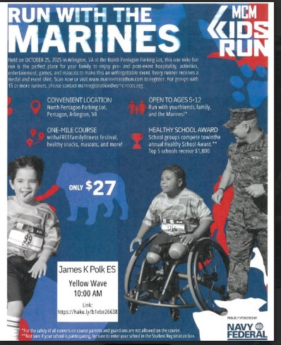 The Annual MCM Fun Run is back! The race will be held on October 25, 2025. Please see the flyer below for more information. Use the direct link to sign up with James K. Polk ( https://haku.ly/b1ebe26638 ) to ensure your child will run in the same heat as their fellow classmates. (fb)