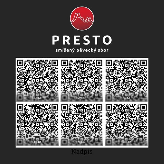 🎶 Podpořte náš sbor a staňte se součástí našeho hudebního příběhu! 🎶 Rosteme, zdokonalujeme se a šíříme radost z hudby. Abychom mohli pokračovat a reprezentovat Plzeňský kraj, hledáme podporu těch, kterým na kultuře záleží. ❤️Nově jsme pro vás připravili možnost přispět prostřednictvím QR kódů v hodnotě 100 Kč, 200 Kč, 300 Kč, 500 Kč a 1 000 Kč. Každý příspěvek nám pomůže pokrýt náklady na naši činnost, koncerty a další hudební projekty. ❤️ Děkujeme všem, kteří nás podporují! Vaše podpora je pro nás nejen finanční pomocí, ale i obrovskou motivací. 📢 QR kódy najdete také na našem webu. Sdílejte, komentujte, podpořte nás! #SborPresto #dekujeme (fb)
