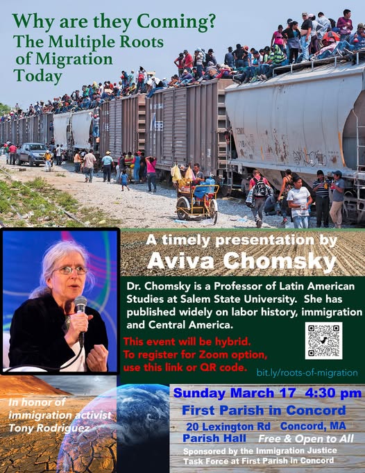 Our friends at the First Parish Concord Immigration Task Force are hosting a talk by Dr. Aviva Chomsky on “Why are they coming? The multiple roots of migration today.” The talk is on Sunday, March 17 at 4:30 in the Parish Hall of First Parish Concord, 20 Lexington Rd. The talk is in honor of the wonderful Tony Rodriguez. Please consider coming! It should be very interesting. Dr. Aviva Chomsky is Professor of History and coordinator of Latin American Studies at Salem State University in Massachusetts. She has published widely on labor history, immigration and “undocumentedness’, Central America, Cuba, and Colombia. Her most recent books include Central America’s Forgotten History: Revolution, Violence and Is Science Enough? Forty Critical Questions about Climate Justice. She has been active in Latin American solidarity and immigrants’ rights movements for several decades. (fb)
