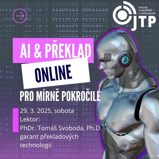 ✨Zbývají poslední 2️⃣ místa! Na tuto sobotu 29. března jsme pro vás připravili další běh celodenního kurzu práce s nástroji tzv. generativní umělé inteligence (genAI) zaměřený na překladatele. 🎤 Těšit se můžete na prakticky zaměřený program, který povede doc. Tomáš Svoboda, garant překladových technologií Ústav translatologie FF UK a člen výboru JTP👏 Kurz je určený mírně pokročilým uživatelům💚 Členům Jednota tlumočníků a překladatelů a přidružených organizací Asociace konferenčních tlumočníků ASKOT a Česká komora tlumočníků znakového jazyka, z. s. připomínáme, že mohou využít výraznou členskou slevu👍 Více informací a přihlašování na webu JTP: https://www.jtpunion.org/akce/umela-inteligence-a-preklad-celodenni-kurz-pro-mirne-pokrocile/ (fb)