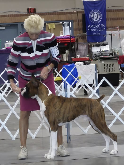 Boxer Mikey & Susan Kelly at the 2025 AKC Lagniappe Classic. Mikey earned 11 points towards his Championship. Good job Team Mikey! 🎉 (fb)