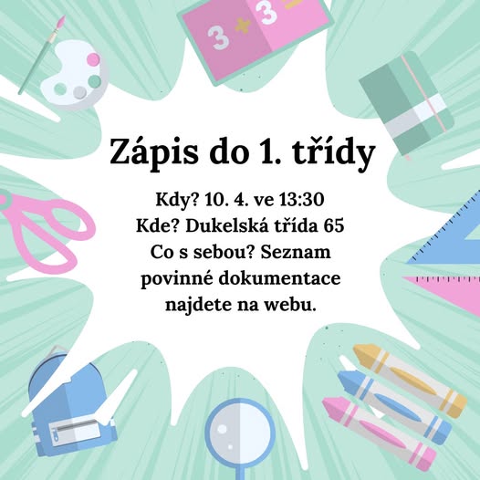Zápis do 1. třídy 10. 4. proběhne zápis do 1. třídy. Ten začne ve 13:30. Začátek je stejný pro všechny, tak k nám přijďte včas, prosím. 🙏 Co s sebou k zápisu? 😌 - občanský průkaz zákonného zástupce - rodný list dítěte (stačí kopie) - přihláška k zápisu - dokument najdete na našem webu - žádost o přijetí dítěte k základnímu vzdělávání - dokument najdete na našem webu Pokud se zápisu nemůžete zúčastnit ze zdravotních nebo jiných závažnýh důvodů, ozvěte se nám s prosbou o domluvu náhradního termínu. 😃 Náš web: https://www.skolaslunovrat.cz/informace-pro-zajemce-o-nasi-skolu/ (fb)