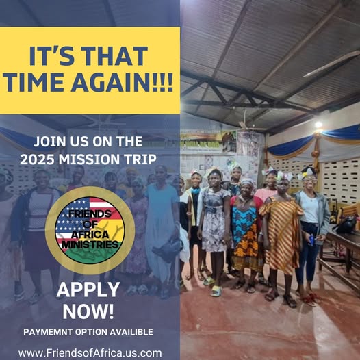 🌍✈️ Calling all missionaries! Join us for the 2025 Friends of Africa Missions trip to Ghana, West Africa! This past year was an incredible blessing, filled with fruitful connections and life-changing experiences. If you feel that tug on your heart to make a difference, we’d love for you to join our team! 🙌❤️ Let’s spread love and hope together! 🌟 #FriendsOfAfrica #MissionsTrip #Ghana2025 #FaithInAction #ServeAndLove #MissionaryLife #LoveThyNeighbor #GodsWork #SpreadTheWord #HopeForAfrica #BlessedToBeABlessing #GlobalMissions #ChristianCommunity #JoinUs #TransformLives #MissionPossible #GospelInAction #FaithJourney #LoveInAction #ImpactTheWorld #ChristCentered #OutreachMinistry #ServeWithJoy #CompassionInAction #UnitedInFaith #TogetherInMission #BeTheChange #AnswerTheCall #KingdomWork #FaithBasedTravel (fb)