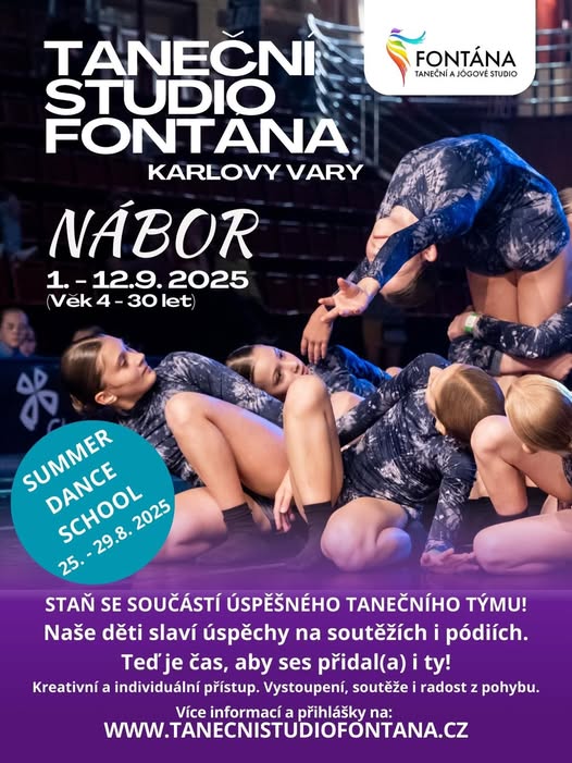 🌟 Nábor do tanečního studia 2025! 🌟 Přidej se k nám od 1. do 12. Září!!! Chceš tančit, bavit se a být součástí skvělého kolektivu? Taneční studio Fontána v Karlových Varech otevírá nábor nových členů – pro děti, juniory i dospělé! 📅 Kdy: 1. – 12. Září 2025 📍 Kde: Taneční studio Fontána Raisova 4, Karlovy Vary 💃 Co tě čeká: • Taneční kurzy různých stylů (moderní tanec, contemporary, jazz, společenský tanec aj.) • Profesionální a přátelský přístup • Možnost vystoupení, soutěží a akcí • Skvělá parta a pozitivní energie 📞 Neváhej a přijď to zkusit! +420 / 603920102 Zastav se u nás nebo nás kontaktuj. 🌐 Více info o nás: http://www.xn--tanenistudiofontana-ykc.cz/ #TanečníStudioFontána #KarlovyVary #Tanec #TanecJeRadost #TanečníŠkola #TanečníKurzy #ModerníTanec #TanecProDěti #TanecProDospělé #Nábor2025 #TančímeVKarlovýchVarech (fb)