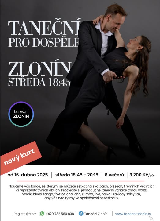16. dubna 2025 ZAČÍNÁME další taneční kurz pro páry 💃🕺🎉 Opět každou středu ve velkém společenském sále KC Zlonín 🌟 Začínáme 16. dubna 2025 jarní kurz v rozsahu 6 lekcí - vždy ve středu 18:45 - 20:15. (16.4., 23.4., 30.4., 7.5., 14.5., 21.5.) Cena: 3.200 Kč/pár 👈 Přidejte se k nám a registrujte se co nejdříve na: ➡️ emailu tanecni.zlonin@gmail.com ➡️ messengeru stránky Taneční Zlonín ➡️ telefonu/WhatsApp +420 732 560 838 Přijďte si s námi zatančit, těšíme se na Vás ☺️ Irina & Jarda (fb)