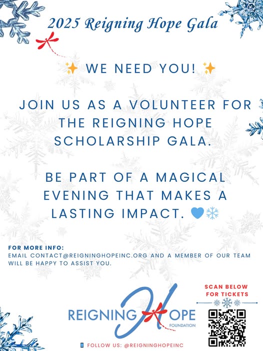 ❄️✨ Calling All Volunteers! ✨❄️ The Reigning Hope Scholarship Gala will be here before you know it, and we need passionate, dedicated volunteers to help bring our Winter Wonderland to life! From greeting guests to assisting with event activities, your support makes all the difference. 💙 📅 Date: Saturday, December 13 📍 Impact Church Be part of a magical evening that empowers students and strengthens our community. Sign up today and help us create a night to remember! (fb)