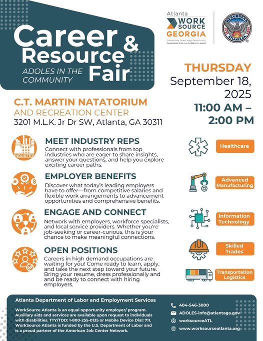 🚨 Atlanta Department of Labor and Employment Services (ADOLES) Career & Resource Fair 🚨 📍 C.T. Martin Natatorium & Rec Center 📅 Thurs, Sept 18 | 11 AM – 2 PM ✅ Meet industry reps ✅ Explore open positions (IT, healthcare, trades & more) ✅ Learn about pay, benefits & advancement ✅ Network with employers & specialists 👉 Bring your résumé & dress professionally! Hosted by: Atlanta Dept. of Labor & Employment Services 🌐 worksourceatlanta.org | 📞 404-546-3000 (fb)