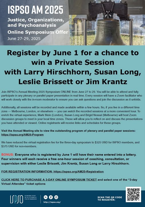 Register by June 1 for a chance to win a Private Session with Larry Hirschhorn, Susan Long, Leslie Brissett or Jim Krantz Join ISPSO’s Annual Meeting 2025 Symposium ONLINE from June 27 to 29. You will be able to attend and fully participate in any plenary or parallel paper presentation in real time. Every session will have a Zoom facilitator who will work closely with the in-room moderator to ensure you can ask questions and join the discussion as it unfolds. Additionally, all sessions will be recorded and made available within a few hours. So, if you live in a different time zone — Melbourne, London, or elsewhere — you can watch the recorded sessions at a more convenient hour. To enrich the virtual experience, Mark Stein (London), Susan Long and Brigid Nossal (Melbourne) will host Zoom discussion groups to meet in your local time zones. These will allow you to reflect on and discuss the presentations you have attended or viewed. Online registrants will receive links and schedules for these groups. Visit the Annual Meeting site to view the outstanding program of plenary and parallel paper sessions: https://ispso.org/AM25-Program We have reduced the virtual registration fee for the three-day symposium to $325 USD for ISPSO members, and $375 USD for non-members. BONUS: Everyone who is registered by June 1 will have their name entered into a lottery. Four winners will each receive a free one-hour session of coaching, consultation, or supervision with either Leslie Brissett, Jim Krantz, Susan Long or Larry Hirschhorn. FOR REGISTRATION INFORMATION: https://ispso.org/AM25-Registration Select one of the “3-day Virtual Attendee” ticket options to get the special price (fb)