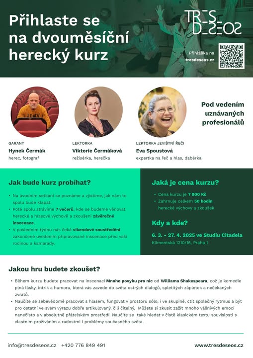 Ze zdravotních důvodů bohužel nemůže Petra Horváthová vést herecký kurz Emancipovaný Shakespeare. Pétě přejeme brzké uzdravení! ❤️🩹 A vy nemusíte mít obavy 👉 kurz plně převezme a i režijně povede Viktorie Čermáková. Další novinkou je změna garanta kurzu. S radostí vítáme Hynka Čermáka – zkušeného herce, držitele Českého lva a fotografa, který nad celým kurzem převezme záštitu. 📢 Zbývá už jen pár míst! Pokud chcete zažít jedinečnou hereckou zkušenost pod vedením profesionálů, přidejte se k nám. Více informací včetně přihlášky najdete na www.tresdeseos.cz . Těšíme se na vás! 💚 Hynek, Viktorka, Eva & tým #TRESDESEOS (fb)