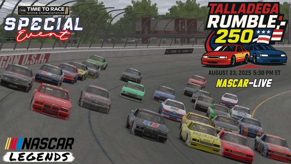 Příští sobotu si milovníci NASCAR mohou zkrátit čekání na očekávaný reálný závod Cup series Coke Zero 400 na Daytoně virtuálním speciálním eventem Talladega Rumble 250 presented by NASCAR-LIVE.eu s mezinárodní účastí závodníků. Závod začne v sobotu 23. srpna od 23:30 h. Pro zájemce z řad závodníků je zde registrace pro tento FREE event: https://docs.google.com/forms/d/e/1FAIpQLSfIrFcq8QI8RD-yZ_ILuWRYMAByY8l_0wB1QRuvwrNOxjcqdw/viewform (fb)