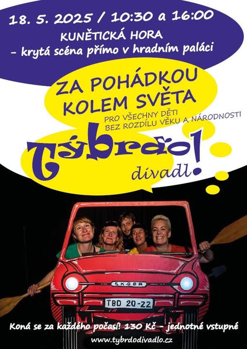 Ahoj všichni! Chybíme vám? Tak to vás dnes určitě potěšíme! 😁 Ode dneška můžete začít rezervovat naše květnové představení na Kunětické hoře, kde budeme hrát už třetí rok v řadě! 😊 Tentokrát zahrajeme Za pohádkou kolem světa, naše interaktivní představení s živou hudbou, kde cestujeme po celém světě! 🗺️ Už teď se moc těšíme na všechny děti i dospěláky, o rezervace si můžete psát do zpráv na našich sociálních sítích. 📩 Vaše Týbrďo ❤️ (fb)
