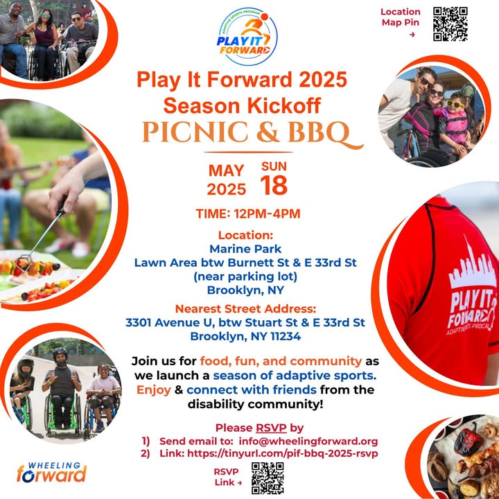 Kick off the 2025 Play It Forward Adaptive Sports season with us at our FREE Community BBQ on Sunday, May 18th at Marine Park in Brooklyn! Join adaptive athletes, families, friends, and supporters for an afternoon of food, fun, music, and community as we launch another season of inclusive sports and celebration. All are welcome—come be part of the movement! Marine Park, Brooklyn | Sunday, May 18 | 12 PM – 4 PM Registration details on the flyer #playitforward #AdaptiveSports #disability #wheelingforward (fb)
