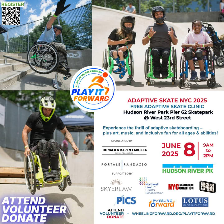 Join us Sunday, June 8 for Adaptive Skate NYC 2025 at Hudson River Park! Free clinic, music, art activities, giveaways & more, open to all ages & abilities. #PlayItForward #AdaptiveSkateNYC (fb)
