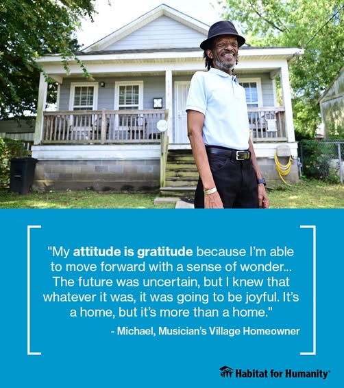 Michael, a local musician and Habitat homeowner, outside his home in the Musicians Village in New Orleans' Upper Ninth Ward, which was built after Hurricane Katrina nearly 20 years ago. (fb)
