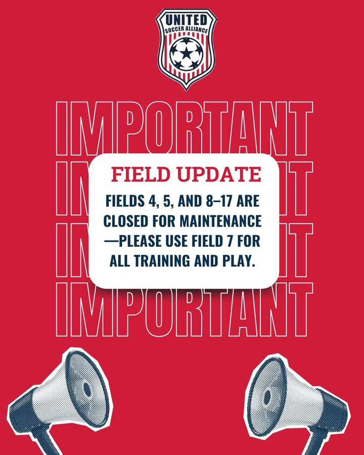 🚧 Field Update 🚧 Fields 4, 5, and 8–17 are currently undergoing major maintenance to prepare for a strong and successful fall season! In the meantime, please focus all training and play on Field 7 to help us protect the work being done. We’ll share updates as field status changes—thanks for your cooperation! ⚽ (fb)