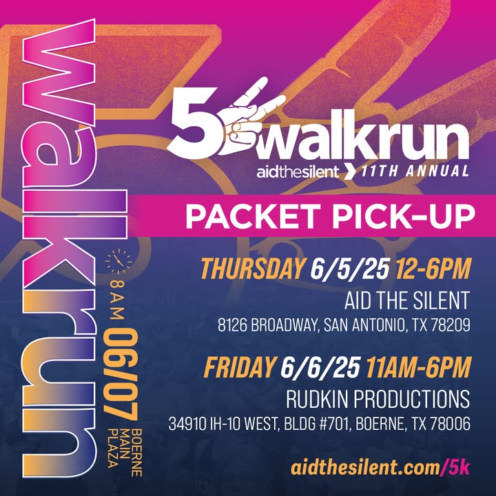✨ Tomorrow starts Packet Pick-Up! ✨ Get ready to lace up and run with purpose at the 11th Annual Aid the Silent 5K Walk/Run! 🏃♀️🏃♂️💨 Beat the race-day lines and grab your race packets early! Packet Pick-Up Dates & Locations: 📅 Thursday, 6/5 | 12–6PM 📍 Aid the Silent — 8126 Broadway, San Antonio, TX 78209 📅 Friday, 6/6 | 11AM–6PM 📍 Rudkin Productions — 34910 IH-10 W, BLDG #701, Boerne, TX 78006 You can still pick up your packet on race day! Race Day Packet Pick-Up starts at 7AM. 🕓 Race Starts at 8AM on Saturday, June 7th at Boerne Main Plaza! 🏁 💥 Online Registration Available Until Friday, 6/6 at 6PM! After that, sign-ups are available on race day at 7AM. Let’s make this the most meaningful 5K yet! #AidTheSilent5K #DeafAwareness #WalkForACause #RunWithPurpose #SanAntonioEvents #BoerneTX #InclusionMatters #CommunityLove #5KFunRun #DeafStrong #NonprofitEvent #GiveBackRun #WalkRun2025 #RunnersOfInstagram #RaceDayReady (fb)