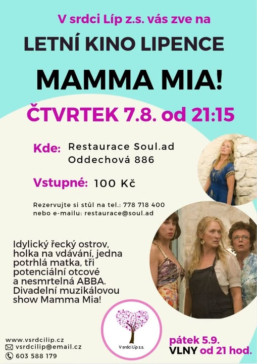 Přejeme vám krásný víkend a ve čtvrtek 7.8. se těšíme na setkání v 📽 Letním kině Lipence. Ve 21:15 hod spustíme letní klasiku Mamma Mia! ☀️🌊🎶 🏝🍷Přijďte se pobavit a vychutnat si letní pohodu. Rezervace míst na: vsrdcilip@email.cz nebo přímo v restauraci Soul.ad, která našemu kinu poskytuje zázemí. V pátek 5.9. promítáme film VLNY 📻 od 21 hod. (fb)