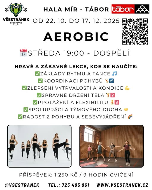 💃AEROBIC PRO DOSPĚLÉ – ROZHÝBEJ TĚLO I MYSL💃 Hledáš cvičení, které tě bude bavit, zpevní tělo a zlepší náladu? 📲Přihláška: https://vsestranek.reenio.cz/cs/term/P1335435/2025-10-22;viewMode=day Na našich hodinách aerobicu zapomeneš na stres a odcházíš s úsměvem! 😍 ✅ Jednoduché, ale efektivní sestavy ✅ Skvělá atmosféra a hudba ✅ Vhodné i pro začátečníky ✅ Skvělý způsob, jak se po dni uvolnit 📍 Tábor – hala Mír 🕖 Každou středu od 19:00 Přidej se k nám a objev, že pohyb může být radost! ✨ (fb)