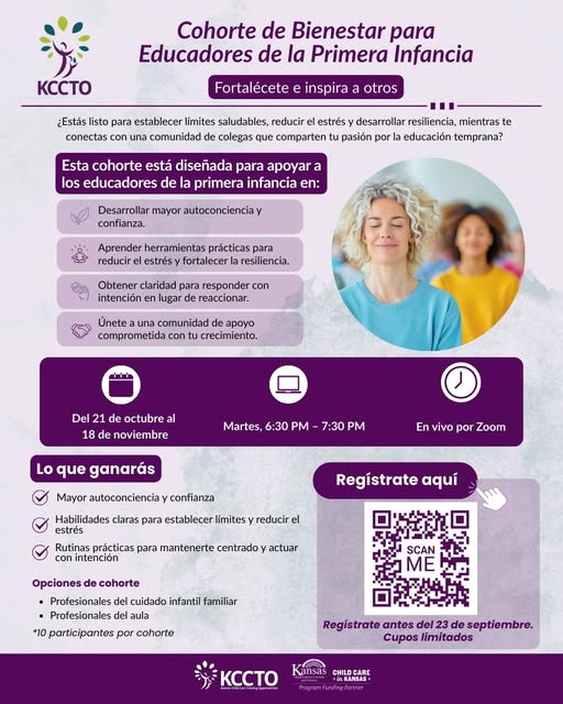 ¡Educadores de la primera infancia, su bienestar es importante! Te invitamos a unirte a nuestro Cohorte de Bienestar para Educadores de la Primera Infancia, donde podrás: ✅Fortalecer tu autoconciencia y confianza ✅Aprender a reducir el estrés y construir resiliencia ✅Conectarte con una comunidad de colegas que te comprende 🗓Cuándo: 21 de octubre – 18 de noviembre | Martes, 6:30–7:30 PM | En vivo por Zoom Cuídate para seguir inspirando y cuidando a los niños que confían en ti cada día. ➡️ ¡Inscríbete hoy! https://kstate.qualtrics.com/jfe/form/SV_bynzaPFEcpcmul8 (fb)