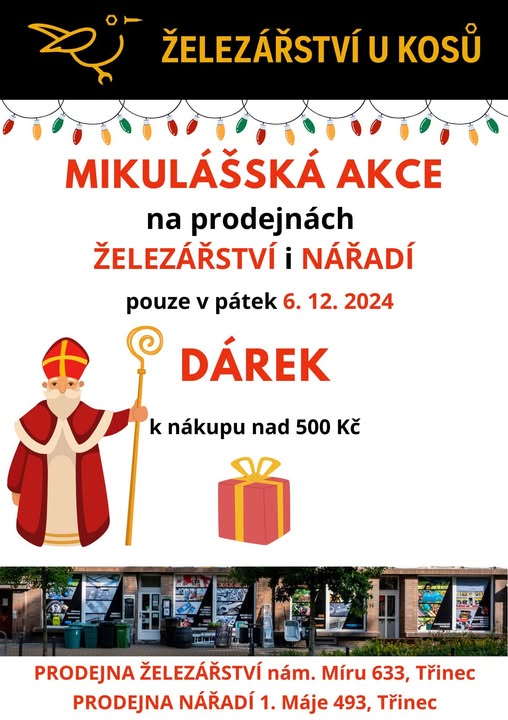 V pátek 6.12.2024 budeme mít v prodejně Železářství na náměstí Míru a v prodejně Železářství a nářadí U Kosů na ulici 1. máje v Třinci akci! Při nákupu nad 500 Kč dostanete praktický dárek!🎄 (fb)