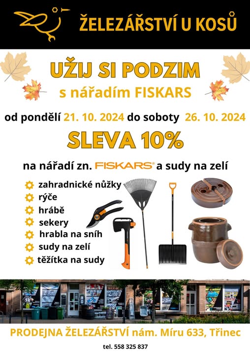 Tento týden probíhá v prodejně Železářství v Třinci na námětí Míru 633 sleva na značku Fiskars a na sudy na zelí :-) Akce probíhá do soboty 26.10.2024! (fb)