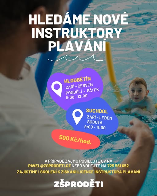 🏊♀️ Hledáme nové instruktory plavání! Baví tě práce s dětmi, máš rád vodu a hledáš smysluplnou práci? Přidej se do našeho týmu! 📍 Kde a kdy? Hloubětín | pondělí až pátek | 8:00–12:00 → výuka plavání pro základní školy Suchdol | každá sobota | 9:00–11:00 → kurzy plavání pro veřejnost (děti 5-13 let) 👥 Koho hledáme? Hledáme empatické, zodpovědné a aktivní lidi, kteří umí jednat s dětmi a mají chuť vést je k pohybu. Zkušenosti z výuky výhodou, ne nutností. 🎓 Nabízíme Možnost zajistit školení k získání licence Instruktor plavání Podporu zkušeného týmu a jasně strukturovanou metodiku Fajn prostředí, kde nejde jen o výkon, ale i o vztahy a pohodu 📩 Zájem nebo dotazy? Napiš nám na info@zsprodeti.cz – ozveme se zpátky co nejdřív. (fb)