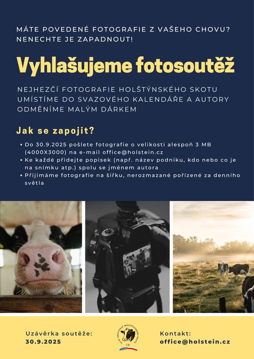 📷🐮 Vyhlašujeme fotosoutěž 📷🐮 Máte povedené fotografie z Vašeho chovu? Nenechte je zapadnout! Zašlete nám je a my ty nejhezčí z nich umístíme do svazového kalendáře. Na autory vybraných snímků čeká malý dárek 🎁 Jak se zapojit? 📷 - Příspěvky pošlete do 30.9.2025 na e-mail office@holstein.cz - Přiložte popisek fotografie (např. název podniku, kdo nebo co je na snímku atp.) se jménem autora Parametry fotografie: - Velikost: alespoň 3 MB (4000X3000) - Na šířku - Přijímáme nerozmazané snímky pořízené za denního světla #fotosoutěž #holsteincz (fb)