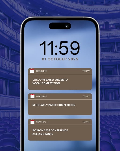 It's happening! The October 1st deadline is two days away for the following: Carolyn Bailey Argento Vocal Competition, Scholarly Paper Competition, and our NEW Conference Access Grants. Your last day to take advantage of the Early-Bird rate for Boston 2026 is October 3rd. (fb)
