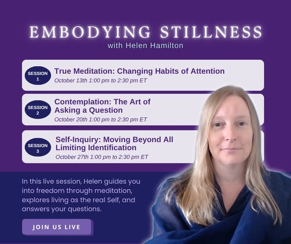 Join Helen Hamilton in Embodying Stillness, a 3-part live series guiding you from mind-made suffering into the silent presence that’s always here. 🗓 Sessions begin Oct 13 | 1:00-2:30PM ET 🔗 Register now — https://tinyurl.com/helen-hamilton-series-2025-fb . . #EmbodyingStillness #HelenHamilton #TrueMeditation #SelfInquiry #StillnessWithin #SpiritualAwakening #CenterforAwakening (fb)