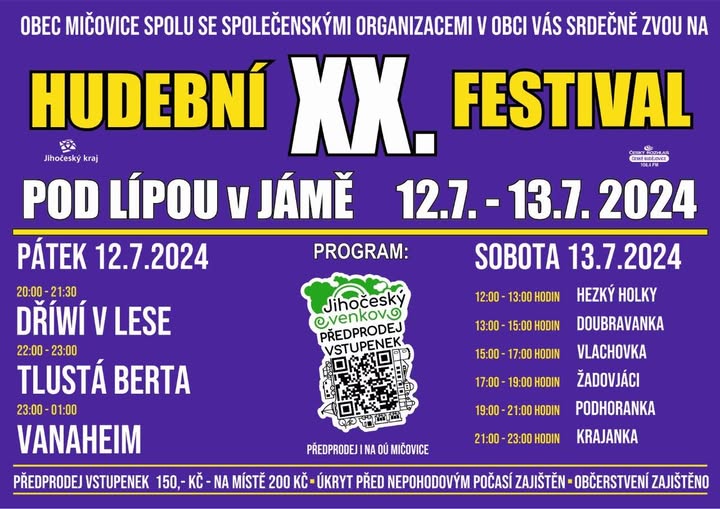 📢XX. Hudební festival Pod lípou v Jámě 12.7.-13.7.2024 👇Kupujte vstupenky v předprodeji na: https://eshop.jihoceskyvenkov.cz/jama_2024 (fb)