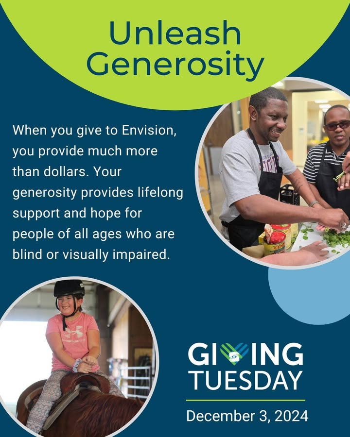 In honor of #GivingTuesday, we ask you to consider giving to Envision. Your contribution will make an impact and with your gift, Envision will be able to continue serving hundreds of people and families who are blind or visually impaired. To give to Envision, visit this link: envisionus.com/donate Thank you for your support! #GivingTuesday #NonProfit #BVI #envisionthepossibilities (fb)