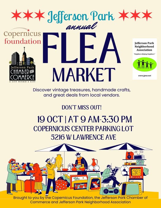 New Time: Jefferson Park Flea Market will start at 10 a.m. (instead of 9 a.m.) Sunday, Oct. 19, and end at 4 p.m. due to the forecast It will still be held in the Copernicus Center parking lot, 5216 W. Lawrence Ave. (vendors are asked to show up at 9 a.m.) Copernicus Center (fb)