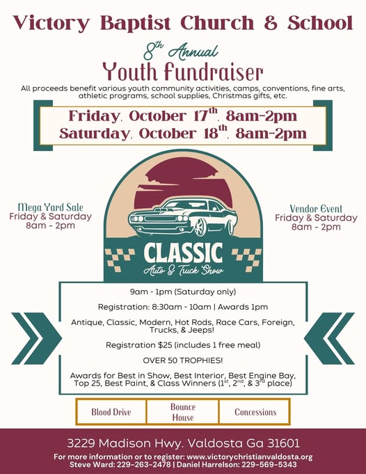 Our upcoming Youth Community Fundraiser is just around the corner! Join us for a great time of family fun on Friday and Saturday, October 17 & 18th. Huge yard sale and vendor event both days, bounce houses, family fun, concessions, and a great Car Show on Saturday! For vendor registration information, please contact the church office at 229-245-7770. To register a car for the car show, visit our website at www.victorychristianvaldosta.org, or register your car at the event. All proceeds benefit youth programs. We hope to see you there! (fb)