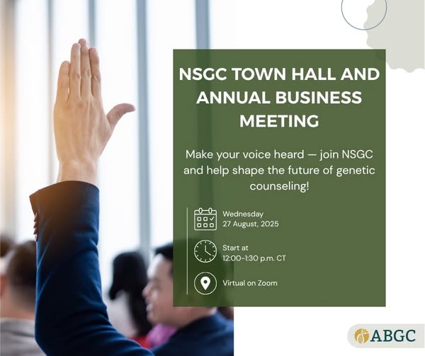 ICYMI: NSGC Town Hall & Annual Business Meeting is coming up! https://www.nsgc.org/Members/Town-Hall-and-Annual-Business-Meeting 📅 Wednesday, August 27 🕛 12:00-1:30 PM CT | 💻 Virtual via Zoom Don’t miss this chance to: ✔️ Hear updates directly from the NSGC Board ✔️ Join a live Q&A ✔️ Cast your vote on critical bylaw changes 🗳️ Live attendance is required to vote — NSGC needs 2,400 members present to move forward! (fb)